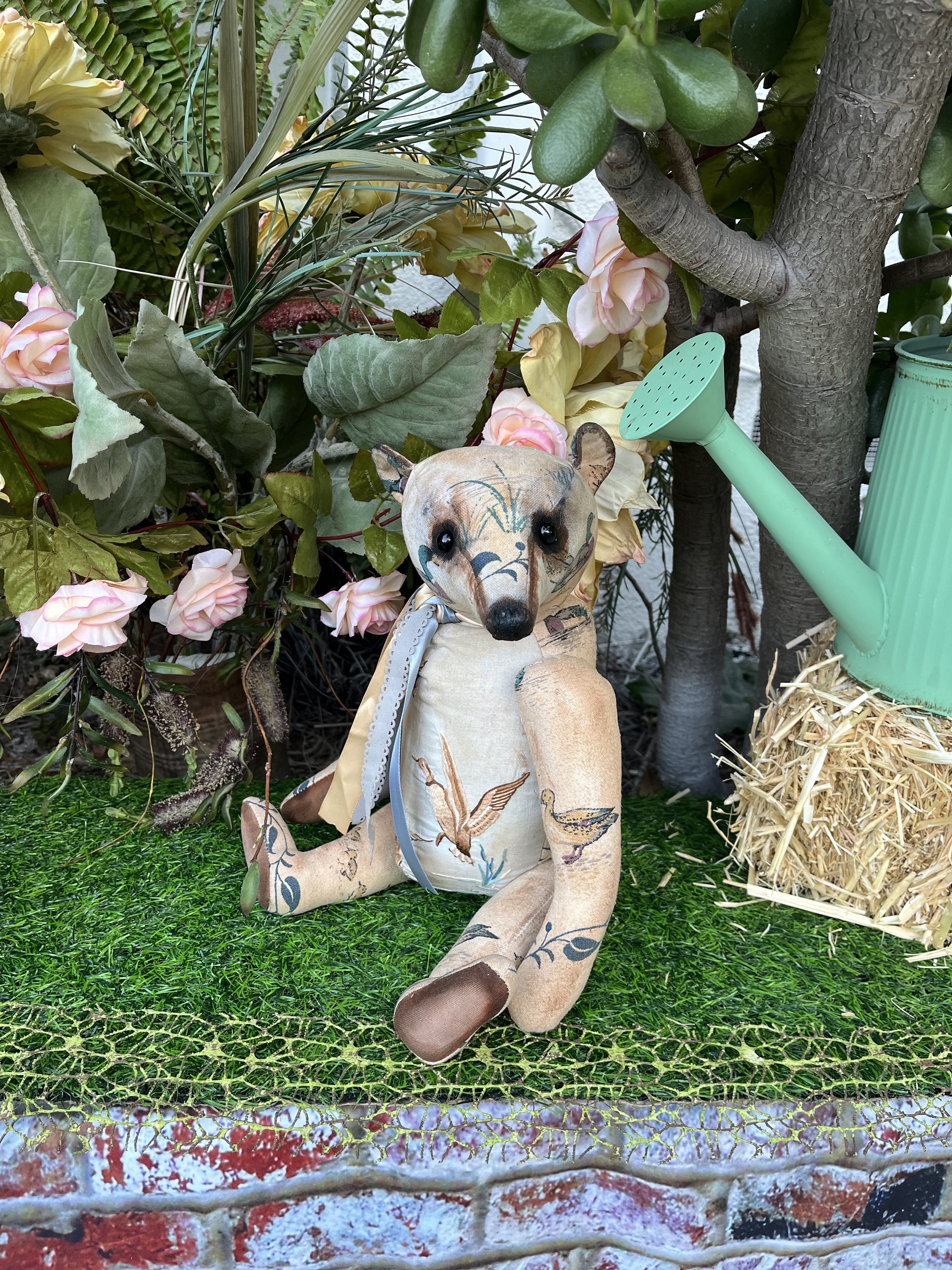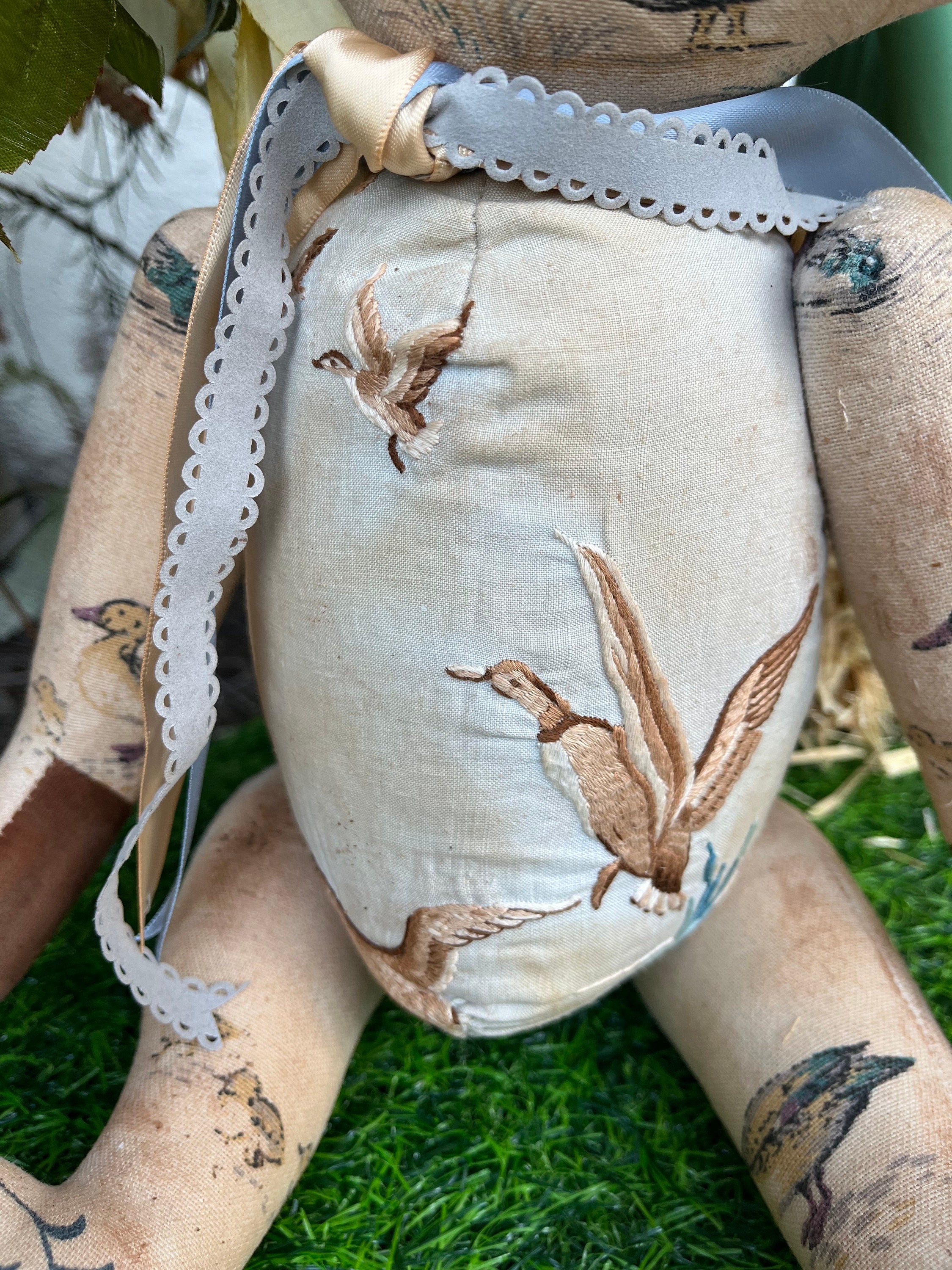 *My Flock* is made from vintage brushed cotton duck print with antique embroidered duck front & measures 14 inches.